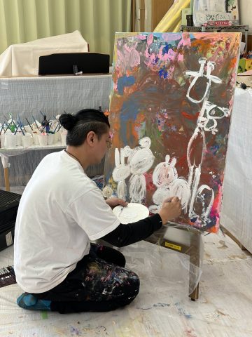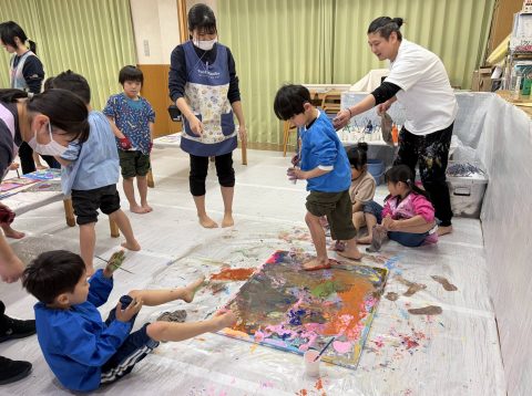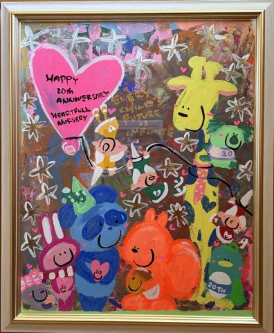 この度、本園創立20周年記念イベントとして、1月15日に、画家五十嵐岳さんをお迎えしたワークショップを行いました。朝からワクワクしていた子どもたち、岳さんの語り掛けも穏やかな中、制作が進みました。30号という大きなキャンバスに、3歳児、4歳児、5歳児の順にアクリル絵の具で描き、筆から手形、いよいよ足形へと発展していき、満足そうな表情でした。昼食後には、岳さんと5歳児きりん組の子どもたちは絵の題名も考え、「20周年のみんなのお祝いの絵」に決まりました。らっこ、こあら、ぺんぎん、うさぎ、ぱんだ、きりんというクラス名の動物たちが、笑っている良い作品となりました。また一つ、子どもたちとの思い出が積み重なりました。額装し、飾ってあります。