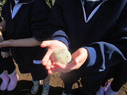 子どもたちの手のひらに一つずつ種芋を渡していきました。子どもたちは、種芋をよく見ています。においをかいでいる子もいました。「うーん、いつもとちがうきがする」「そうだね」と、友だちと話をしていました。