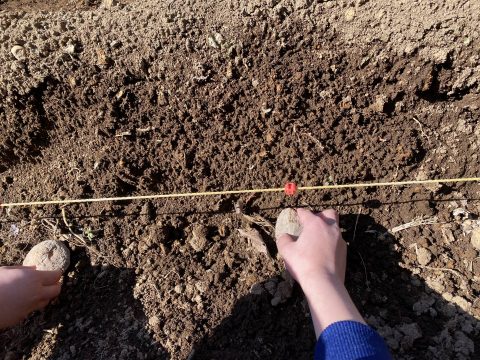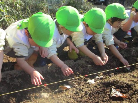 赤い目印の下に種芋を植えていきます。平らな面を土に向け、そっと置いていました。「これで、だいじょうぶかな?」「おおきくなってね」「おいしくなーれ」と、種芋に声をかけていました。畑から出て、じゃがいものことや種芋の植え方を教えてくださった、わたなべさんに挨拶をしました。