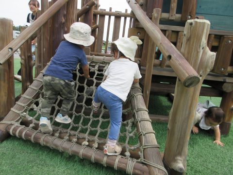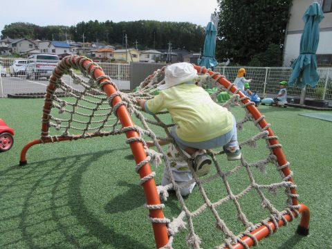 こあら組では、戸外活動が大人気です。保育士が活動内容を伝えると「やったー!おそと、いくー!」と満面な笑みで大喜び。自分で帽子を被り、園庭に行く準備万端です!お姉さん・お兄さんの遊びを真似することが増え、鉄棒や太鼓橋などに挑戦しています。「せんせい、みててね」と話しながら真剣な表情で取り組む姿が素敵です!全身の力を上手く使い、難しいことでも試行錯誤して挑戦しています!これからも、全身を使った活動を楽しみながら挑戦する気持ちを大切にしていきたいと思います。