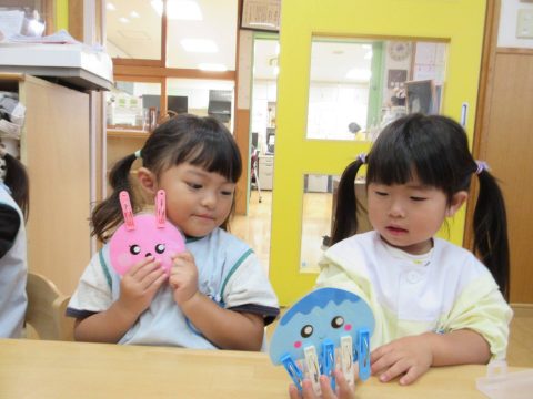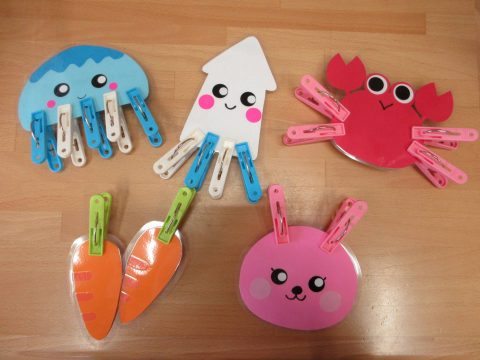 ホーム > 手作りおもちゃ > 洗濯ばさみおもちゃ 洗濯ばさみおもちゃ ぺんぎん組になり、遊び着やパジャマのボタンに挑戦しようとする子が増えたので、指先を使った手作りおもちゃを作りました。 台紙にはいろいろな色の丸シールが貼ってあり、シールの色と洗濯ばさみの色を合わせながら遊ぶ姿が見られます。「みて!くらげになったよ」「あおはここ!」と話しながら挟んでいき、完成すると友だちと見せ合う姿も可愛らしいです!